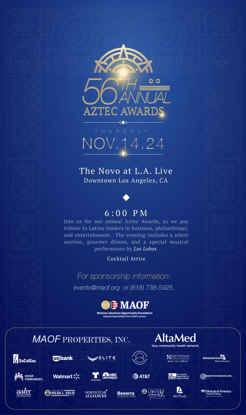 LOS ÁNGELES- La Mexican American Opportunity Foundation (MAOF) organizó su 56ª Entrega Anual de Premios Azteca el jueves 14 de noviembre en The Novo at LA Live en el centro de Los Ángeles. Esta noche inspiradora honró a los líderes que hacen contribuciones significativas a la comunidad latina mientras celebran la cultura, la unidad y el progreso.